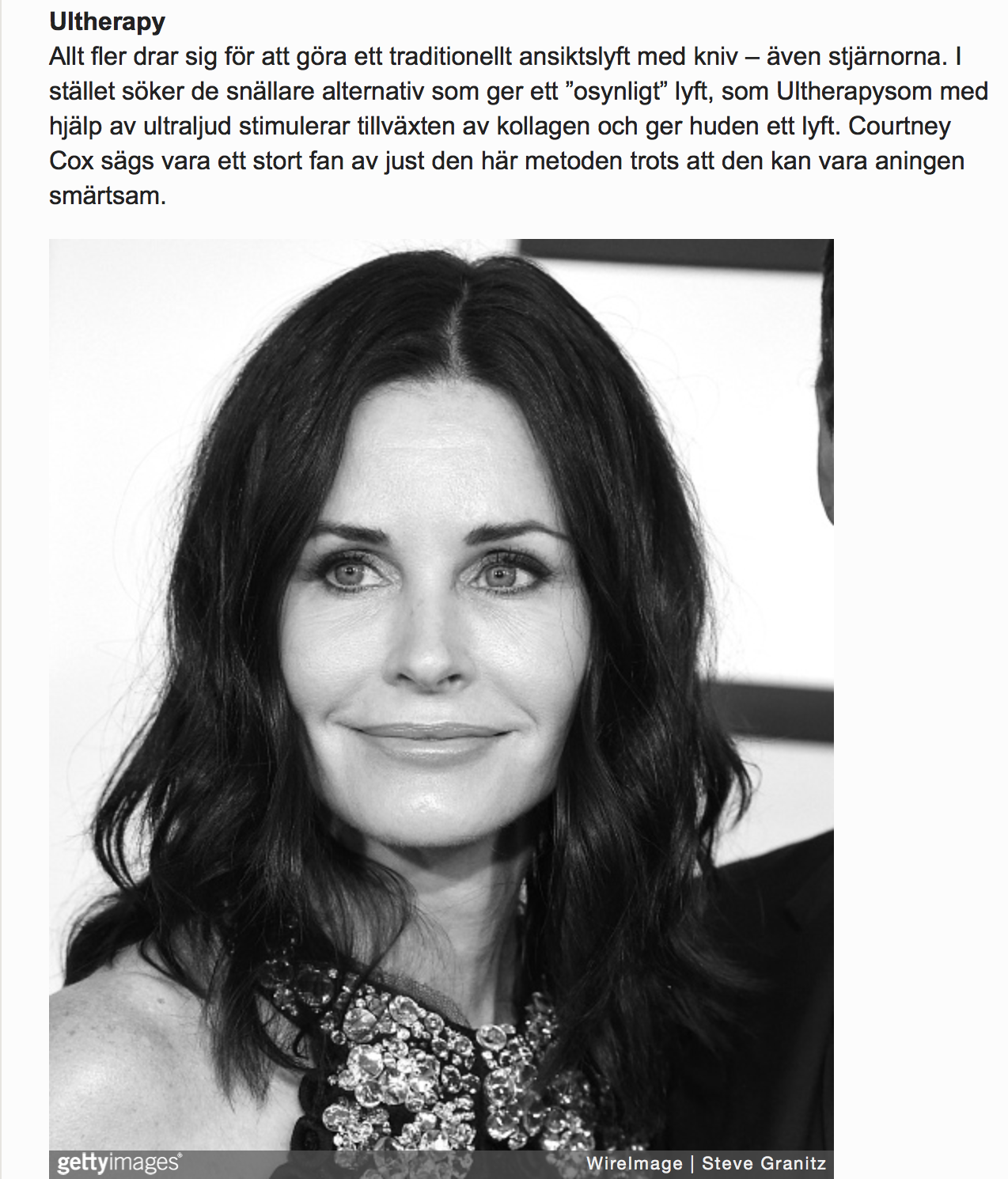 Allt fler drar sig för att göra ett traditionellt ansiktslyft med kniv – även stjärnorna. I stället söker de snällare alternativ som ger ett ”osynligt” lyft, som Ultherapy som med hjälp av ultraljud stimulerar tillväxten av kollagen och ger huden ett lyft. Courtney Cox sägs vara ett stort fan av just den här metoden trots att den kan vara aningen smärtsam."